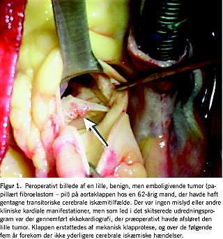 Ved alder ≤ 65 år uden prædisponerende årsag til apopleksi (hypertension, diabetes, hyperkolesterolæmi, carotisplaques eller trombofili) fandt arbejdsgruppen det rimeligt at udrede med ekkokardiografi, selv hos patienter, der ikke havde mislyd, feber eller hjerteinsufficiens [1]. Sandsynligheden for sjælden embolikilde i hjertet (myksom, valvulært papillært fibroelastom (Figur 1 ), tavs mitralfejl, atrieseptumdefekt og uventet intrakardial trombose) er væsentligt større hos yngre personer end hos ældre. Også nogle af nedennævnte behandlingsmæssigt uafklarede årsager til tromboemboli forekommer særlig hyppigt hos yngre patienter. Omvendt var alder over 65 år en selvstændig risikofaktor for cerebralt insult i studier af patienter med atrieflimren [3].