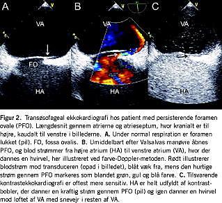 Persisterende foramen ovale (PFO) forekommer hos 20-25% af alle, atrieseptumaneurisme (ASA) hos under 5%, men begge forekommer væsentlig hyppigere i populationer med cerebrovaskulært insult hos patienter, der er yngre end 50-60 år [1, 4]. Det antages, at klinisk stumme trombefragmenter fra venesystemet kan føres gennem PFO til systemkredsløbet under forbigående højre-venstre-shunt; f.eks. lige efter anvendelse af bugpressen, der tilbageholder blodet fra højre atrium. Ophævelse af presset fører til øget blodindstrømning i højre atrium, og PFO åbnes, hvis trykket her overstiger trykket i venstre atrium (Figur 2 ). Et hosteanfald kan føre til samme. ASA forekommer hyppigt sammen med PFO, og ASA er i ekstremt sjældne tilfælde beskrevet med indhold af trombe [1]. I en undersøgelse af apopleksipatienter med ASA, hvor acetylsalicylsyre blev givet som sekundær profylakse, forekom der ingen recidiver [5]. Behandlingen svarer således til konventionel sekundær profylakse efter apopleksi, og undersøgelse for ASA kan i almindelighed ikke anses for at være indiceret.