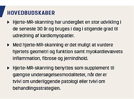 Udredning af patienter med formodet kardiomyopati er initialt baseret på billeddannelse af hjertet med ekkokardiografi, hvor man bedømmer volumen, funktion, myokardietykkelse og en visuel mønstergenkendelse [1]. MR-skanning af hjertet (CMR) benyttes dog i stigende grad i udredningen af patienter, hos hvem man har mistanke om kardiomyopati. CMR er guldstandard til ikkeinvasiv vurdering af hjertets funktion (vurderet ved kammervoluminer, uddrivningsfraktion (EF)) og myokardiemasse), og CMR er velegnet til vurdering af myokardiets struktur [2-4]. Patienter med kardiomyopati skannes oftest med intravenøs gadoliniumkontrast, der vha. late enhancement-teknik gør det muligt at visualisere lokaliserede områder i myokardiet med øget ekstracellulærvolumen (f.eks. fibrose eller sarkoide læsioner). Ved formodet stabil iskæmisk hjertesygdom har myokardieperfusion med gadoliniumkontrast og adenosin-stressundersøgelse en høj samlet sensitivitet og specificitet (vurderet over for guldstandarden koronararteriografi med intrakoronare trykmålinger) [5, 6].