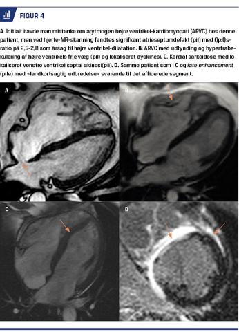 Pludselig død før 50-årsalderen skyldes i knap 10% af tilfældene ARVC, og mindst en tredjedel forekommer familiært. Afficerede områder dilaterer, særligt i højre ventrikel, og myokardiet erstattes delvist af fibrose og fedt. ARVC er en syndromdiagnose, hvor en kombination af en række forskellige kriterier (minore og majore) kan udløse diagnosen [25]. CMR er ikke nødvendig for at stille diagnosen, men information fra CMR søges ofte, da CMR er særligt velegnet til visualisering af højre ventrikel og vurdering af højre ventrikels kontraktionsmønster. CMR vil vise akinesi, dyskinesi eller dyssynkroni i højre ventrikels frie, tynde væg og af og til fibrose samt evt. mikroaneurismer (Figur 4A, B). Fund af fænotype, som er forenelig med ARVC og samtidig dilatation af højre ventrikel (> 90 ml/m2 for kvinder og > 100 ml/m2 for mænd) betragtes som foreneligt med ARVC. Med CMR forsøger man samtidig at udelukke andre årsager til højre ventrikel-dilatation