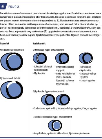 De fleste patienter med myokarditis har ikkedilateret LV med normal funktion. Først efter langvarig myokarditis og måske igangværende subklinisk inflammation vil myokarditis resultere i DCM. CMR benyttes, når man skal stille differentialdiagnose over for iskæmisk hjertesygdom. Med late enhancement-teknik vil man vha. CMR ofte kunne afgøre, om patienter har dilatation pga. iskæmisk hjertesygdom eller pga. noniskæmisk hjertesygdom (Figur 2). Ved myokarditis er