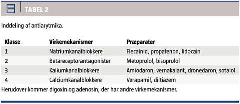 Traditionelt inddeles antiarytmika i fire klasser, alt efter hvilken overordnet virkning de har på hjertets aktionspotentiale (Vaughan-Williams klassifikation). I Tabel 2 er angivet de mest almindelige antiarytmika, der anvendes i Danmark. Lidocain, betareceptorantagonister, calciumkanalblokkere, digoxin og adenosin har ingen sikker kardioverterende effekt over for AF. Dronedaron er ikke undersøgt til kardiovertering af nyligt opstået AF, og sotalol anbefales heller ikke hertil, idet effekten er lav og sent indtrædende [1, 15]. Tilbage står følgende præparater: