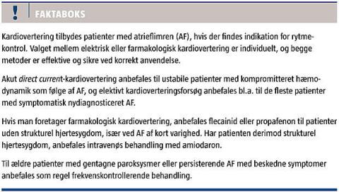 Såfremt der findes indikation for rytmekontrollerende behandling, kan man vælge enten farmakologisk eller elektrisk direct current (DC)-kardiovertering. Studier tyder på, at der er en højere succesrate af DC-kardiovertering end af farmakologisk kardiovertering [7-9]. For begge strategier gælder, at sandsynligheden for vellykket kardiovertering er større, jo kortere tid arytmien har varet. Årsagen er formentlig en kombineret elektrisk og strukturel remodellering af atrierne, der bidrager til vedligeholdelse af arytmien [10, 11].