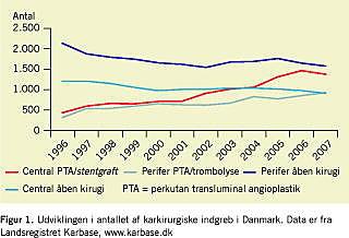 Det karkirurgiske speciale er under betydelig forandring i disse år. Der er dels sket en stor udvikling i de medicinske behandlingsmuligheder af de karkirurgiske arterielle grundsygdomme (aterosklerose og aneurismer), der ikke vil blive berørt yderligere her, og dels er der sket en stadig teknologisk udvikling mod mindre invasive behandlingsmetoder. Dette har medført markante ændringer i behandlingstilbuddet til patienterne, og dermed har udviklingen også ændret de krav, der stilles til organisation af behandlingen og til den karkirurgiske speciallæge. Efter en initial stor udvikling i åbne kirurgiske metoder sker udviklingen nu hovedsageligt inden for minimalt invasive endovaskulære metoder, der i stigende omfang har erstattet åben kirurgi, både ved aortoiliakal sygdom og arteriesygdom i ekstremiteterne. I overensstemmelse hermed er der de senere år set et mindre fald i antallet af åbne operationer med en samtidig stor stigning i antallet af endovaskulære indgreb (Figur 1 ). Denne udvikling forventes at fortsætte de kommende år. De nye endovaskulære metoder er udviklet af radiologer, mens det fortsat er en karkirurgisk opgave at rådgive om behandlingsvalg og stå for de indledende og opfølgende undersøgelser. Denne opdeling i en klinisk og en teknisk varetagelse af behandlingen er under pres af flere årsager: