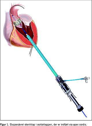 Transapikal aortaklapbehandling (TAP-AVI) kræver tværfagligt samarbejde imellem kardiologer, anæstesiologer og thoraxkirurger. Vi anvender et kateterisationsrum med højopløseligt røntgenapparatur til gennemlysning, udstyr til invasiv monitorering og anæstesi samt transøsofageal og transtorakal ekkokardiografi. Patienten intuberes med enkeltløbet tube og lejres i rygleje. Apex cordis markeres på thoraxvæggen, og via arteria femoralis placeres et pigtail -kateter over aortaklappen til injektion af røntgenkontrast. Indgrebet foretages uden brug af hjerte-lunge-maskine, men der kan anlægges venøs og arteriel adgang via femoralkar, der kan anvendes ved behov for hurtig etablering af cirkulationsstøtte i forbindelse med konvertering til åben kirurgi. Patienterne i dette materiale var alle vurderet inoperable via konventionel kirurgi, og konvertering til åben kirurgi var derfor ikke en mulighed. Der blev foretaget en mini-torakotomi med en incision på ca. 5 cm i 5.-6. interkostalrum. Perikardiet og apex cordis lokaliseredes, og der indsattes torakotomispærre. Herefter åbnedes perikardiet, som fikseredes til brystvæggen med holdesuturer. Myokardielle pace -elektroder blev påsyet hjertet - og svarende til den senere adgang via apex cordis - placeredes to filtarmerede suturer med tourniquet. Patienten hepariniseredes, venstre ventrikel kanyleredes via apex cordis, og en blød guidewire ført es antegradt over aortaklappen. En 14F sheat indlagdes over guidewiren, som udskiftedes med en stivere model, hvor spidsen placeredes i aorta descendens. Den stenostiske aortaklap dilateredes med ballon henover den indlagte wire. Selve dilatationen skete under hurtig pacing af venstre ventrikel (frekvens 160-220/minut) med det formål at minimere hjertets kontraktioner. Efter ballondilatationen fjernedes ballon og sheat og erstattedes af en 33F afleverings-sheat , hvorigennem den komprimerede stentklap fremførtes. Stentklappen blev indsat (Figur 1 ) under hurtig pacing for at nedsætte risikoen for migration af klappen under implantationen. Stentklappen placeredes midt i anulus aortae. Positionering af klappen foretoges ved hjælp af røntgengennemlysning, transøsofagal ekkokardiografi (TEE) og aortografi. Selve implantationen foregik ved opblæsning af den dilatationsballon, stentklappen var monteret på. Efter TEE-verificering af tilfredsstillende funktion og position af stentklappen, fjernedes sheat samt guidewire. Apexadgangen lukkedes med de tidligere anlagte filtsuturer. Perikardiet lukkedes delvist, der indlagdes 20F pleuradræn og mini-torakotomien lukkedes.