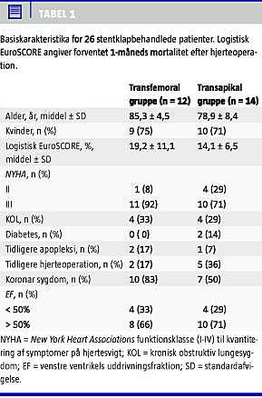 Materiale og metoder: Registerstudie med prospektiv registrering af præspecificerede parametre. I alt 26 patienter blev forsøgt behandlet med stentklap, 12 via transfemoral (TFA-AVI) og 14 via transapikal (TAP-AVI) adgang. Henholdsvis 75% og 71% var kvinder, og gennemsnitsalderen var 85 + 4,5 år i TFA-AVI-gruppen og 79 + 8,4 år i TAP-AVI-gruppen.