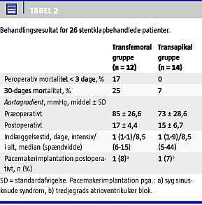 Resultater: I TFA-AVI-gruppen blev der foretaget vellykket stentklapimplantation hos 9/12 (75%) og i TAP-AVI-gruppen hos 13/14 (93%) af patienterne. Mortaliteten efter 30 dage var 25% i TFA-AVI- og 7% i TAP-AVI-gruppen. Klapareal hos patienter med vellykket stentklapimplantation steg fra 0,6 + 0,13 cm 2 til 1,6+0,39 cm 2 i TFA-AVI-gruppen og fra 0,7 + 0,2 cm 2 til 1,6 + 0,37 cm 2 i TAP-AVI-gruppen. 91% af patienterne angav klinisk bedring postoperativt.
