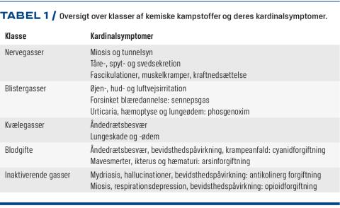Antallet af terrorangreb og angrebsforsøg rettet mod vestlige nationer har været markant stigende over de seneste to årtier. Danmarks engagement i de væbnede konflikter i Mellemøsten samt Central- og Vestafrika har bidraget til, at terrortruslen mod Danmark og danske styrker i udlandet gennem en årrække har været stigende. Vi ønsker med denne artikel at udbrede kendskabet til de klassiske toksidromer, der forekommer ved forgiftning med de mest kendte kemiske kampstoffer.