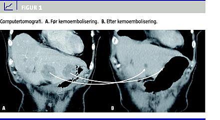 En 52-årig kvinde blev opereret for mammacancer for seks år siden. For to år siden fandt man knogle- og levermetastaser. Patienten havde fået antiøstrogener, docetaxel og epirubicin. Levermetastaserne var de eneste, der ikke var i ro, og patienten indgik derfor i eksperimentel behandling med capecitabin og oxaliplatin, hvor oxaliplatin hver anden gang blev givet som kemoembolisering direkte i leveren. Patienten fik fire serier i den nye protokol. Effekten af denne behandling varierer, men i dette tilfælde skrumpede levermetastaserne betydeligt (Figur 1 ).