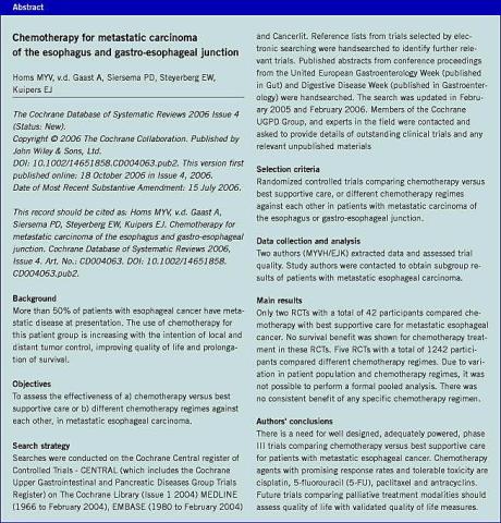 I Cochrane-analysen har man stillet to hovedspørgsmål: 1) Forbedrer og forlænger kemoterapi overlevelsen for patienter med metastaserende øsofaguscancer? og 2) er der et optimalt kemoterapiregimen?