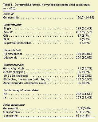 I alt 425 kvinder i alderen fra 14 til 39 år (gennemsnit: 20,7 år; standardafvigelse (SA): 3,6 år) deltog i undersøgelsen (Tabel 1). I alt 53 kvinder havde endnu ikke havde haft seksuel debut. Det gennemsnitlige antal sexpartnere for seksuelt aktive kvinder var 6,1 (SA: 7,5). Andelen af kvinder, der havde haft flere end to sexpartnere, var 44,1% i gruppen 14-19 år, 66,7% i gruppen 20-24 år og 89,6% i gruppen på 25 år eller ældre.