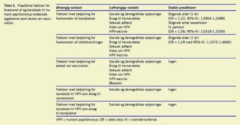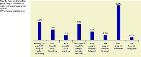 I 19 ud 425 tilfælde (4,5%) blev »kønssygdomme«, »virus« eller HPV angivet som årsag til celleforandringer på livmoderhalsen. Tilsvarende angav 17 ud af 425 (4%) »kønssygdomme«, »virus« eller HPV som årsag til livmoderhalskræft, men blot fem (1,2%) angav direkte HPV som årsag. Kun tre (0,7%) angav direkte HPV som årsag til kondylomer (Figur 1). Der fandtes ingen prædiktive faktorer for kendskab til HPV som årsag til kondylomer og livmoderhalskræft Tabel 2.