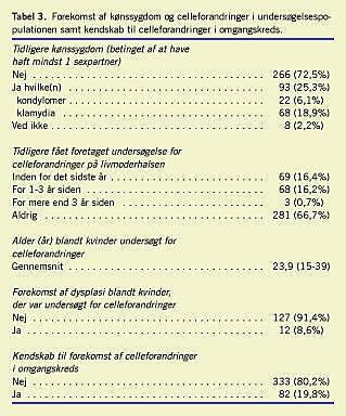 Blandt alle kvinder havde 33,6% fået foretaget en smear-test (gennemsnitsalder 23,9 år). Blandt de kvinder, der var 24 år eller mere, havde 81,6% tidligere fået foretaget cervixcytologisk undersøgelse. Blandt de kvinder, der havde fået foretaget en smear-test, angav 8,6% (KI: 4,0-13,3%) at have fået påvist celleforandringer. Alle kvinder med celleforandringer var ældre end 20 år, og alle havde haft flere end to sexpartnere. Alder var den eneste stabile prædiktive faktor for forekomst af celleforandringer (se Tabel 2). Blandt de adspurgte kvinder angav 19,8% kendskab til kvinder i deres omgangskreds, som havde haft celleforandringer (Tabel 3).