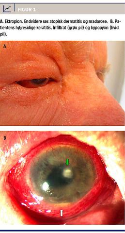Ved den objektive undersøgelse var patientens syn reduceret til fingertælling på højre øje og til 0,5 på venstre øje. Der var bilateral ektropion med synlig diastase til bulbus (Figur 1A). Øjenomgivelserne fremstod med patientens velkendte atopisk dermatitis-forandringer. Der var ingen lagoftalmus. På højre cornea sås et 1,5 × 1,5 mm stort infiltrat med ulcus og ødem samt hypopyon i forreste kammer (Figur 1B). På venstre cornea sås udtørringskeratopati. Corneae havde naturlig og egal sensibilitet. Podning fra højre cornea viste Streptococcus haemolyticus-keratitis, som bedredes med lokal antibiotisk behandling og medførte visusfremgang til 0,2. Endvidere blev der iværksat behandling med lubrikerende øjendråber bilateralt, hvilket bedrede udtørringskeratopatien.
