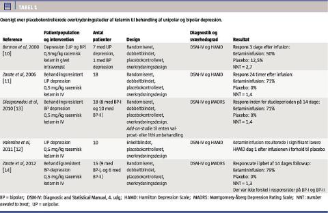 Som det fremgår af Tabel 1, identificerede vi fem placebokontrollerede studier, hvoraf to omhandlede patienter med bipolar sygdom med depression, to omhandlede patienter med unipolar depression, og i et enkelt studie havde man inkluderet både patienter med bipolar sygdom og patienter med unipolar depression. Det fremgår ligeledes, at ketamin havde signifikant antidepressiv effekt i alle tilfældene. Berman et al undersøgte effekten af en enkelt dosis racemisk ketamin (0,5 mg/kg givet intravenøst over 40 min) hos syv patienter med depression [10] og fandt en signifikant reduktion i sværhedsgraden af depressionen vurderet ved Hamiltons depressionsskala (HAMD) allerede 240 min efter infusionen, og denne effekt vedblev, indtil opfølgningen stoppede 72 t. efter infusionen. Størrelsesordenen i reduktionen var 10-15 point på HAMD efter aktiv infusion. Halvdelen af patienterne, der fik ketamin opnåede respons i løbet af 72 t. (50% reduktion af HAMD), mens dette kun sås hos 12,5% i placebogruppen. Depressionsscoren returnerede til udgangsværdierne 1-2 uger efter ketamininfusionen. Deltagerne vurderede deres dissociative symptomer på en visuel analog skala, og denne score toppede 10 min efter infusionen og vendte tilbage til baseline-værdien efter 2 t.
