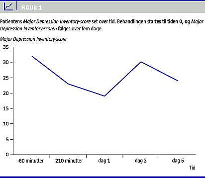 Ved indlæggelsen talte patienten med latens, var klamtsvedende og forpint. Patienten var plaget af håbløshedsfølelse, selvmordstanker og suicidale impulser. Major Depression Inventory (MDI)-score var 32, hvor en score over 30 svarer til en svær depression. Patienten blev opstartet med antidepressiv medicin og henvist til ECT-behandling. For at lindre patienten og reducere selvmordsfarligheden blev patienten behandlet med S-ketamin 0,5 mg/kg. S-ketamin blev opløst i 1 liter isoton NaCl og givet intravenøst over en time. Under infusionen var patienten observeret af plejepersonalet. Patienten angav som eneste forbigående bivirkning en sovende fornemmelse i læben. To timer efter infusionen angav patienten, at »det lysnede«, og MDI-scoren faldt til 23 (Figur 1 ). Efter seks dages indlæggelse og en behandling med S-ketamin var patienten ikke længere forpint eller suicidalfarlig, talen var uden latenstid, og patienten blev overført til åbent afsnit til ECT-behandling. Patienten blev udskrevet efter 14 ECT-behandlinger og 107 dages indlæggelse.