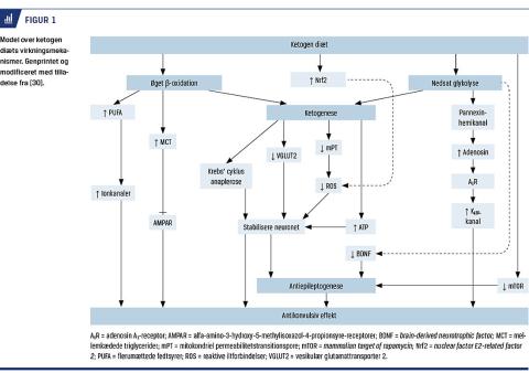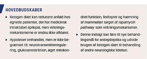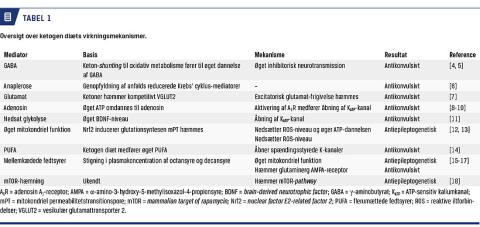 Ketogen diæt (KD) er et af flere behandlingsalternativer ved medicinsk intraktabel epilepsi. Faste har i årtusinder, og høj-fedt/ lav-kulhydrat-diæt har siden 1920’erne været anvendt til reducering af epileptiske anfald. Når glukose ikke er tilgængeligt i kroppen, metaboliseres fedtsyrer, og der dannes ketonstoffer. Disse passerer blod-hjerne-barrieren og indgår som alternativ energikilde i Krebs’ cyklus ved fraværet af glukose. Mindst 50% af de patienter, der prøver KD, oplever mindst 50% anfaldsreduktion, og 10-15% bliver anfaldsfrie af KD [3]. De stadig ukendte virkningsmekanismer for KD har været omdrejningspunkt for forskning i over 20 år, og der er fremsat mange hypoteser. Formålet med denne artikel er at gennemgå KD’s virkningsmekanismer fordelt på fem hypoteser: ændring i neurotransmittere, glukoserestriktion, øget mitokondriel funktion, effekt af fedtsyrer og inhibering af mammalian target of rapamycin (mTOR)-pathway (Tabel 1). Disse hypoteser kan skabe perspektiver for forståelse af sygdomsmekanismer og fremtidsmuligheder i behandlingen af svære epilepsier og andre neurologiske sygdomme.