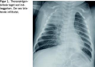Der blev foretaget røntgenundersøgelser af thorax som viste bilaterale infiltrater (Figur 1 ). C-reaktivt protein var ved indlæggelsen 143, men faldt til 60 efter påbegyndelse af antibiotikabehandling. Siden steg det imidlertid til 165. Normalværdi < 10. Leukocytter fandtes at være 29,5 × 106 med lymfocytose, men steg siden til 100 × 106 . Dyrkning af trakealsekret viste ingen patogene fund. Bordetella pertussis blev verificeret ved polymerasekædeundersøgelse af trakealsekretet.