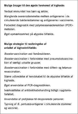 Summary Pertussis epidemic Ugeskr Læger 2003;165:4205-4207 An increase of the incidence of pertussis has been reported worldwide and might be explained by factors, such as rapidly waning immunity, more sensitive diagnostic methods, gene changes in the circulating bacterial strains, and atypical presentation of pertussis cases. Strategies to reduce the burden of pertussis might be booster vaccination of selected population groups, early diagnosis, and prompt antibiotic intervention. Furthermore, increased awareness of atypical cases, and surveillance of antigen changes in the bacterial strains might be a benefit.