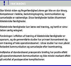 Internationalt ses en stigende erkendelse af, at mange af de fejl og utilsigtede hændelser, der forekommer i kirurgi, ikke kun skyldes mangelfulde kliniske færdigheder, men også utilstrækkelig kommunikation og samarbejde. Såvel i retrospektive studier med analyse af utilsigtede hændelser [1] som i prospektive studier har man belyst dette. Nedsat situationsbevidsthed hos kirurgen - forstået som evnen til at indsamle og bearbejde informationer og planlægge herudfra - har medført flere tekniske fejl under operationen [2]. Utilstrækkeligt samarbejde i operationsteamet medfører højere risiko for komplikationer som eksempelvis postoperativ infektion, blødning eller glemte fremmedlegemer [3]. Forskel på individuelle kirurgiske præstationer er forsøgt forklaret ud fra kirurgens udvisning af god objektivt observerbar adfærd, såsom tilpasningsevne, kognitiv fleksibilitet og kommunikationsstil hos kirurgen [4]. Ikketekniske færdigheder, såvel individuelt hos kirurgen som i hele operationsteamet, er således væsentlige for at sikre operationspatienten et godt resultat.
