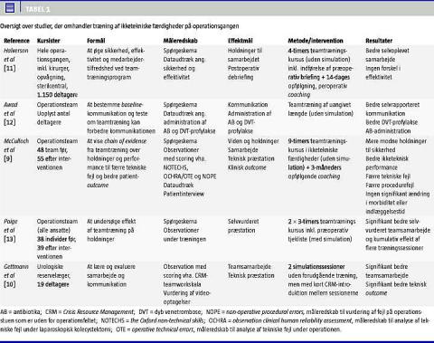 I Tabel 1 vises formål, kursister, måleredskab, effektmål, metode samt resultat fra fem originalarbejder, der omhandler træning af ikketekniske færdigheder på operationsgangen. Alle studierne var prospektive uden kontrolgruppe. I et arbejde [9] måtte den planlagte kontrolgruppe udgå, idet kontrolgruppen følte, at der ved observationerne blev stillet spørgsmålstegn ved deres præstation.