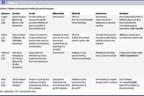 I Tabel 2 ses en oversigt ov er fire arbejder, som omhandler præoperativ briefing. I to arbejder [14, 15] har man udelukkende koncentreret sig om indførelse af en standardiseret præoperativ briefing. I to af de tidligere nævnte studier havde man indførelse af præoperativ briefing som delmål [11, 12]. Ved en præoperativ briefing samles operationsteamet, deltagerne introduceres for hinanden og gennemgår kort det planlagte indgreb, inklusive relevant anamnese samt eventuelle risikomomenter ved operationen. Tanken er, at teammedlemmerne opbygger en fælles forståelse - en såkaldt shared mental model, og samtidig er der mulighed for at afstemme forventninger til operationen, og »huller« i teammedlemmers viden kan lukkes. Lingard et al viste, at indførelse af præoperativ briefing medførte færre kommunikations-brister (med og uden synlige negative konsekvenser såsom procedurefejl og unødige forsinkelser) [14]. I flere tilfælde medførte briefingen ændrede handlinger, som eksempelvis at patienten med allergisk disposition ikke fik administreret det antibiotikum, der fulgte journalen. I et meget stort internationalt studie af Haynes et al viste man overbevisende effekt på patientmorbiditet og -mortalitet. Mere end 3.700 team på otte hospitaler verden over indførte præoperative tjeklister, og som følge heraf opstod der 36% færre postoperative komplikationer og dødsfald [15].