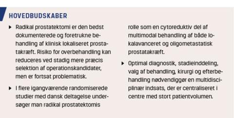 Parallelt med udviklingen i andre vestlige lande har man også herhjemme været vidne til en markant stigning i antallet af kirurgiske indgreb for lokaliseret PCa, og p.t. udføres der på seks danske afdelinger i alt godt 1.100 indgreb årligt. Solid evidens understreger, at højt patientvolumen, der sikrer kirurgisk rutine, erfaring og ekspertise hos et hold af kirurger, samt multidisciplinært samarbejde med involverede specialer er afgørende vigtigt for behandlingskvaliteten. Optimal selektion af patienter til RP er den største udfordring i behandlingen af lokaliseret PCa, og minimering af overbehandling må have højeste prioritet. Dette, sammenholdt med udredningen af RP’s potentiale som del af en multimodal behandlingsstrategi for avanceret PCa, er en stor opgave, som kræver forskningssamarbejde både nationalt og internationalt.