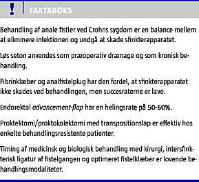 Summary Surgical treatment of anal fistulas in Crohn's disease Ugeskr Læger 2012;174(38):2219-2222 The treatment of transsphincteric anal fistulas in Crohn's disease is a balance between the elimination of the sepsis and the functional outcome. Loose setons can be used as a preoperative drainage or chronic treatment. Fibrin glue and the anal fistula plug are methods with excellent functional outcomes, but the success rate varies. The endorectal advancement flap is considered to be the gold standard. Ligation of the intersphincteric fistula tract is promising. Proctectomy or proctocolectomy in combination with transposition flaps may be necessary. A success rate of 66-70% has been reported.