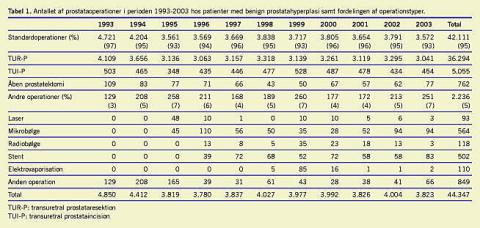 I Tabel 1 ses antallet af operationer pr. år og fordelingen af indgreb, der blev foretaget. I 2003 blev der foretaget 21% færre operative indgreb på prostata end i 1993. Standardoperation (TUR-P, transuretral prostataincision (TUI-P) og åben prostatektomi) blev foretaget hos 93-97% i perioden, og TUR-P udgjorde langt den største del. Anvendelsen af åben prostatektomi, der udføres ved store prostatavolmina, var konstant i forhold til det totale antal operationer fraset enkelte år med en lav anvendelse. Brugen af TUI-P, der anvendes ved sm å prostatavolumina, steg marginalt.