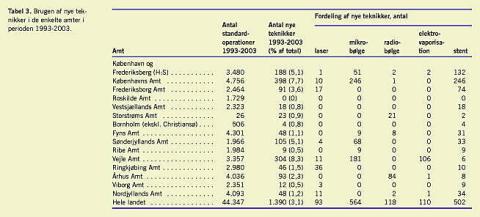 Blandt de nyere teknikker blev mikrobølgebehandling og stentanlæggelse udført hyppigst (Tabel 1). Begge er ligesom radiobølgebehandling teknikker, der gennemføres i lokal anæstesi. Laserbehandling og elektrovaporisation, der udføres i generel eller spinal anæstesi blev udført hos relativt få. For mikrobølge- og laserbehandlings vedkommende blev der anvendt flere forskellige apparaturer og teknikker. Ligeledes blev der i perioden anvendt flere typer stent. I alle amter, fraset Roskilde Amt, havde man i opgørelsesperioden anvendt mindst en nyere teknik (Tabel 3 ), men der var en stor spredning pr. amt på antallet af operationer med ny teknik (Tabel 3). Således har man i to amter (Bornholms Amt og Ribe Amt) udført under ti nye teknikker i hele perioden, dvs. mindre end en pr. år, mens man i to amter (Københavns Amt og Vejle Amt) har udført over 300. Der var statistisk signifikant korrelation mellem den procentuelle anvendelse af nye teknikker og det totale antal operationer, der blev udført i de enkelte amter (Spearmans rho 0,598, p = 0,019).