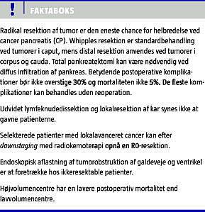 Radikal kirurgisk behandling er den eneste potentielt kurative behandling for CP, men resektion er kun mulig hos cirka 20% af patienterne. Detaljeret præoperativ patientselektion og omhyggelig kirurgi i højvolumencentre med velfungerende multidisciplinær tilgang til patienterne er nødvendig for at opnå et optimalt behandlingsresultat.