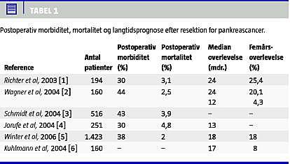 Radikal kirurgisk behandling er den eneste potentielt kurative behandling ved cancer pancreatis (CP), men er kun mulig hos cirka 20% af patienterne. Selv efter radikal resektion har patienten fortsat en dårlig prognose med en median overlevelse på 18-32 måneder og en estimeret femårsoverlevelse på 10-20% [1-7] (Tabel 1 ). Blandt de faktorer, som giver den bedste prognose, er højt differentieret tumor, størrelse < 3 cm og fravær af lymfeglandelmetastaser (N0-status) [2, 4, 5, 8]. De vigtigste procedurerelaterede faktorer er mikroskopisk radikal resektion (R0-resektion) og fravær af betydende intraoperativt blodtab og postoperative komplikationer [2, 4, 5, 8]. Det er åbenbart, at variation i disse faktorer kan forklare mange af de forskelle i prognosen, som findes i litteraturen. Hertil kommer, at ikke kun den postoperative mortalitet, men også langtidsoverlevelsen er afhængig af såvel kirurgens som institutionens erfaring med de operative procedurer. En nøje selektion af patienterne kombineret med omhyggelig kirurgi er derfor nøglen til en del af de prognostiske faktorer, og dette har ført udviklingen hen imod en centralisering af behandlingen af patienter med CP [9].