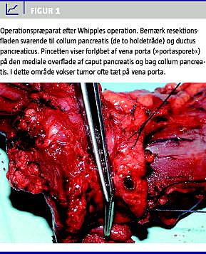 Omkring 40% af patienterne har lokalt avanceret CP p diagnosetidspunktet - frst og fremmest invasion omkring vasa mesentericae superiores og vena portae. I hjvolumencentre kan en veneresektion med fri resektionsrand gennemfres med en morbiditet og mortalitet p niveau med en standard Whipple procedure. Sfremt man opnr R0-resektion, synes overlevelsen at vre p hjde med overlevelsen hos patienter uden vens infiltration. I et nyligt systematisk review af 52 studier, hvor PD blev kombineret med karresektion, fandt man dog en median overlevelse p kun 13 mneder (femrsoverlevelse: 6%), og man konkluderede, at gevinsten ved karresektion var beskeden [18]. Downstaging med radiokemoterapi er forsgt ved lokalt avanceret CP, og data antyder, at downstaging kan bringe selekterede patienter fra et lokalavanceret (ikkeresektabelt) stadium til et stadium, hvor radikal operation er mulig [19]. Studierne er dog vanskelige at evaluere, idet patientselektionen ofte er drligt beskrevet, og da der ikke findes fastlagte kriterier for resektabilitet fr eller efter kemoradioterapi.