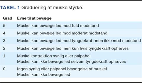 For at kunne planlægge den korrekte kirurgi ved neuromuskulære rekonstruktioner er der en række forhold, der skal være analyseret [1, 2]. Mange patienter har diagnosen på henvisningstidspunktet. Alle patienter er dog ikke udredt, og fælles er, at det skal afklares, om deformiteten er betinget af den neurologiske lidelse, eller om der er konkurrerende årsager til deformiteten. Udredningen omfatter anamneseoptagelse suppleret med billeddiagnostik, hvor røntgenoptagelse af belastet fod og ankel er obligatorisk og ofte suppleres med CT (gerne belastet) samt MR-skanning eller SPECT-CT. Det afklares, om deformiteten er i slutstadiet og eventuelt fikseret, eller om den er i progression og stadig fleksibel. Samtidig afklares det, hvilke muskel-sene-komplekser og led som er toneangivende i deformitetens morfologi. Som anført nedenfor er der regler for, hvilke sener der kan transponeres, og her er muskelstyrken afgørende [2]. Kraften i relevante muskler gradueres(Tabel 1). Det fastlægges, om der er spasticitet i de muskler, der primært er årsag til deformiteten, og hvilke muskler der kan benyttes til at modvirke deformiteten. Patientens gangfunktion vurderes, og ofte vurderes det, at hjælpemidlerne er insufficiente, hvilket medfører behov for justering af eksempelvis ortoser forud for kirurgi. De involverede muskel-sene-kompleksers kraft og funktion vurderes, ligesom de involverede led undersøges for bevægelighed og eventuelle kontrakturer. Dette sammenholdes med billeddiagnostikken og er afgørende for, om kontrakte led kan løsnes, eller om det er nødvendigt med artrodeser. Behovet for korrigerende osteotomier for at balancere foden, før transpositionerne gennemføres, vurderes. I visse tilfælde kan det også være nødvendigt at udføre tenotomier enten som isoleret indgreb eller som en delprocedure for at opnå det ønskede resultat.
