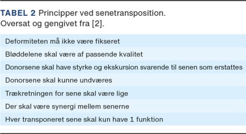 En række vigtige principper følges, når senetranspositioner planlægges (Tabel 2). Der bør minimum være styrke 4 i den muskel-sene, der transponeres, hvis man skal forvente brugbar aktivitet i den transponerede muskel, idet der tabes 1 styrkegrad ved transpositionen. Det kan være nødvendigt at transponere en muskel-sene med styrke 3, hvis man herved fjerner en deformerende kraft. Transposition af en fasisk sene foretrækkes frem for transposition af en nonfasisk. Nervesystemet kan omprogrammeres til at benytte en given muskel, som normalt bøjer anklen, til at strække anklen i koordination med de øvrige funktionelle muskler, der indgår i bevægelsen.