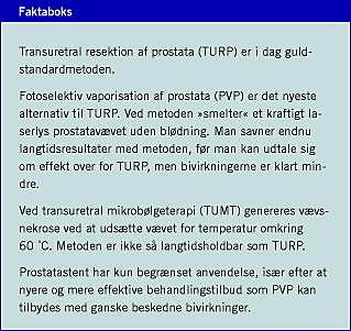 TURP er fortsat guldstandarden, men den enkelte patient kan foretrække skånsommere behandling, eksempelvis TUMT, trods øget risiko for genbehandling [5, 6]. Ved den klassiske TURP må man kalkulere med risiko for per- og postoperativ blødning, der kan medføre behov for blodtransfusion; endvidere bør patienterne afbryde en evt. tromboseprofylakse med f.eks. acetylsalicylsyre i et par uger omkring operationen. Ved anvendelse af PVP er risikoen for blødning minimal, og tromboseprofylakse med f.eks. acetylsalicylsyre kan derfor fortsættes uafbrudt. Patienten skal dog være informeret om risikoen for postoperativ urge.