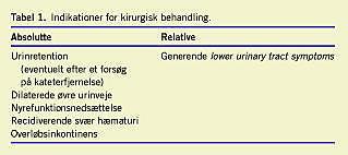 Dansk Prostataråd har opstillet absolutte og relative indikationer for kirurgisk intervention (Tabel 1 ).