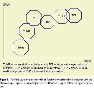 Ved valg af behandlingsmetode til patienter uden absolut indikation må man i samråd med patienten afveje risiko og effekt ved de forskellige tilgængelige procedurer (Figur 1 ). På figuren har vi på baggrund af litteraturen og efter egne erfaringer forsøgt at vurdere de forskellige behandlingsmetoder efter følgende effektmål: normalisering af vandladning og symptomlindring over risiko for komplikationer i form af blødning, inkontinens og perioperativ reoperation. Således er TVP effektiv over for normalisering af vandladning, men medfører en høj komplikationsrisiko. Ved PVP derimod er normalisering af vandladningen næsten på linje med TVP, men risikoen er minimal.