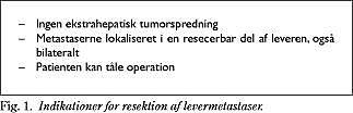 Indikationerne for resektion af levermetastaser fra kolorektal cancer er, at der ikke er ekstrahepatisk spredning, at metastaserne er lokaliseret i en resecerbar del af leveren, og at patienten kan tåle operation (Fig. 1 ). Alder per se er ikke kontraindikation for resektion. I sjældne tilfælde kan både lunge- og levermetastaser reseceres.