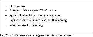 Metakrone levermetastaser diagnosticeres med samme undersøgelser, men her bør tillige foretages laparoskopi og laparoskopisk UL-scanning (LUS) for at påvise karcinose og små levermetastaser, som forekommer hos 10-15%, og som ikke har kunnet ses ved ekstern UL-scanning, CT eller MR-scanning (13). LUS foretages efter henvisning til leverkirurgisk afdeling og umiddelbart før den planlagte leverkirurgi. Evt. præoperativ embolisering af højre eller venstre v. portae-gren foretages også på denne afdeling (2, 9). Hvis der trods ovennævnte undersøgelsesprogram fortsat består mistanke om ekstrahepatisk tumorspredning, kan PET være en værdifuld undersøgelse (14).