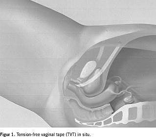 TVT blev introduceret i 1996 af Ulmsten et al [1]. Indgrebet udføres sædvanligvis i lokal anæstesi + sedation på sammedagskirurgisk basis. Selve proceduren varer ca. 30 min og består i anlæggelse af en polypropylenslynge under midturethra via et snit i vaginas forvæg og to små suprapubiske incisioner (Figur 1 ). Der udføres rutinemæssig cystoskopi for at udelukke blære- og urethraperforation. Ved perforation af blæren fjernes tapen og genanlægges i samme seance.