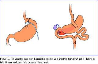 I Danmark anvendes to operationsmetoder laparoskopisk Roux-en-y gastric bypass (LRGB) og gastric banding (GB), se Figur 1. Ved GB placeres et justerbart bånd omkring den øvre del af ventriklen lige under cardia. Der tilstræbes en pouch på 15-20 ml, således at fødepassagen besværliggøres. Ved hjælp af et væskefyldt slangesystem og et kammer, der anbringes subkutant, kan man justere båndets volumen og dermed omfanget af restriktion af pouch 'en til resten af ventriklen. Der foretages ved GB ikke ændringer i gastrointestinalkanalens anatomi. Ved LRGB deles toppen af mavesækken, således at der dannes en pouch på 15-25 ml. Herefter anastomoseres tyndtarmsben og pouchen, og tarmsystemet deles således, at der er et 50-150 cm alimentært tarmben. Først herefter tilkobles det tarmben, der bærer galde- og pancreassekret, en såkaldt Roux-en-Y-anastomose. Operationen medfører, at føden ikke kommer i kontakt med den distale og største del af ventriklen, duodenum og de øverste ca. 75 cm af jejunum, mens Y-slyngen fortsat tillader føden kontakt med mave-, galde- og pankreassekret, og slyngen bringer samtidig hurtigt føden til den mere distale del af tyndtarmen.