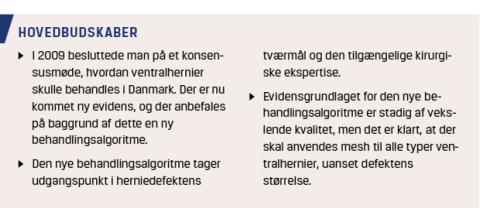 Siden 2010 er der kommet ny evidens, som har medført ændringer i anbefalingerne for den kirurgiske behandling af ventralhernier. Det anbefales nu, at der også ved operation af primære ventralhernier med helt små defekter (0-2 cm) forstærkes med mesh i modsætning til tidligere, hvor alene sutur var anbefalet. Selvom evidensen er sparsom, anbefales det, at ventralhernier med defekter på > 6 cm opereres åbent, hvor man tidligere havde en grænse på 15 cm. Ved defekter > 10 cm i tværmål er herniet pr. definition komplekst og skal behandles på et regionalt herniecenter. For at sikre national implementering er den foreslåede behandlingsalgoritme præsenteret og diskuteret på et konsensusmøde med hernieinteresserede kirurger på Dansk Kirurgisk Selskabs årsmøde i november 2017. Selvom evidensen stedvist er mangelfund, var klinikerne enige om, at den nye anbefaling til størrelsesklassifikation og behandling gav mening ud fra et klinisk perspektiv.