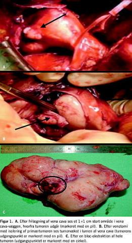 Operationen indledtes med sternumsplit og total cirkulatorisk støtte med kanylering i aorta og vena cava superior uden at berøre højre atrium. Hjertet blev fibrilleret, og man åbnede til højre atrium og udelukkede, at der var indvækst i atrievæggen. Herefter foretoges laparotomi, hvor man efter frilægning af hele vena cava kunne påvise en 1 × 1 cm stor tumor udgående fra og med gennemvækst af væggen i vena cava 1,5 cm under indløbet af levervenerne (Figur 1 A). Intraoperativ UL gav ikke mistanke om metastasering, hvorefter man besluttede sig for at udføre venotomi og tumorekstraktion i 18 °C hypotermi. Med tang på aorta descendens blev der foretaget venotomi fra nyreveneniveau til over tumorens udgangspunkt (Figur 1B). Efterfølgende kunne hele tumoren eksideres en bloc inkl. tumortrombosering fra leverveneostier (Figur 1C). Cava blev herefter lukket med perikardie-patch , og efter tangfjernelse skyllede man med godt to liter blod for at fjerne resterende trombemateriale fra cava. Ved en intraoperativ kontrol-UL sås der normalt flow i porta, levervener, iliaca og cava uden synlige tromber.