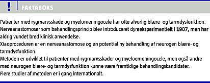 Neurogen blære- og tarmdysfunktion er blandt de største gener hos patienter med rygmarvsskader og myelomeningocele [1-3]. For begge grupper er livslængden øget pga. moderne behandlingsprincipper, og da rygmarvsskadede gennemsnitligt kun er 28 år ved traumet, og myelomeningocelepatienter fødes med deres tilstand, medfører det, at patienterne lever mange år med deres handikap. Behandlingsudfordringen skifter dermed fra et fokus på livslængde til også at indeholde livskvalitet [4, 5].