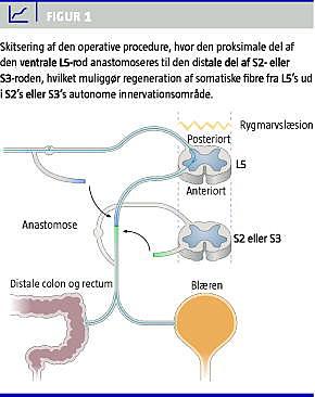 Ved reinnervation ad modum Xiao skabes en kunstig somatoautonom refleksbue under læsionsniveau i rygmarven. Ved proceduren foretages hemilaminektomi fra L4 til S3. Intraduralt identificerer man derefter L5, S2 og S3 med neurofysiologisk assistance. Den ventrale rod adskilles fra den dorsale. De ventrale rødder overskæres, og den proksimale L5-rod anastomoseres til den distale S2 eller S3 (Figur 1 ). Herved opnås en unilateral nerveanastomose fra L5 til S2 eller S3, hvilket muliggør regeneration af somatiskmotoriske nervefibre ind i det autonome innervationsområde [13]. Da somatisk-motoriske, præganglionære autonome og postganglionære parasympatiske aksoner alle bruger neurotransmitteren acetylkolin, er der på transmitterniveau også grundlag for anastomose. Den præganglionære reinnervation understøttes af dyreeksperimenter, hvor man har fundet både nikotinerge og muskarine receptorer i refleksbuen [14]. Reinnervationen er tilendebragt senest efter 18 måneder, hvilket er længere end forventet ud fra det alment anerkendte dogme om en nervereinnervationshastighed på 1 mm pr. dag [1].