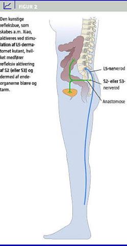 Den beskrevne refleksbue aktiveres ved kutan stimulation af L5-dermatomet på den opererede side enten elektrisk eller ved at knibe eller kradse (Figur 2 ). Stimulation rapporteres at udløse spontan vandladning, men ikke spontan defækation. Uspeci-fikt angives, at tarmfunktionen også bedres [1].