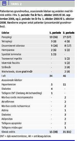 Andelen med klinisk ostitis, defineret enten ved positive knogledyrkninger, ostitis på røntgenbillede eller klinisk tydelig ostitis ved den kirurgiske revision af tryksåret, var 15 (38%) ud af 39 indlæggelser i den første periode. I anden periode var andelen med klinisk ostitis 31 (61%) ud af 51 indlæggelser.