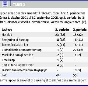 I første periode blev der rekonstrueret 44 sår med i alt 44 lapper, mens der i anden periode blev rekonstrueret 59 sår med 56 lapper. Af Tabel 3 fremgår det hvilken type lap, der er anvendt til rekonstruktion af defekterne.