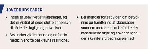 effekten af klagesager i forhold til de indledningsvist beskrevne formål, er litteraturen om de negative konsekvenser mere omfattende. Der peges som noget væsentligt på risikoen for sekundær viktimisering (SV) af involverede læger [6, 10, 11]. SV betegner eftervirkningerne hos sundhedspersoner efter fejl eller behandlingsforløb, hvor noget gik galt. Det drejer sig typisk om emotionelle, kognitive og adfærdsmæssige reaktioner. SV risikerer at underminere såvel det professionelle virke som privatlivet, og opgørelser tyder på en prævalens af SV fra en tiendedel til over 40% [6]. Som beskrevet af Wu, kender stort set enhver kliniker det gennemsyrende ubehag ved at have fejlet [5]. Tvivlen på egne evner, følelsen af eksponering og den mere eller mindre instinktive trang til at tjekke, om nogen har bemærket miseren. Dertil kommer den tilbagevendende bekymring over, hvad der er det rigtige at gøre, og om man skal fortælle det til nogen; på den ene side bør man gå til bekendelse, og på den anden side gruer man for konsekvenserne, andres vurdering og patientens vrede [5]. Fejl i sundhedsvæsenet er belastende for de involverede sundhedspersoner, og noget tyder på, at der fortsat finder tabuisering sted i lægekulturen, hvorved muligheder for læring kan forspildes [12]. Der er derfor argumenteret for mere opmærksomhed herpå, og der peges på behovet for ekstra støtte og rådgivning til de berørte læger [12].